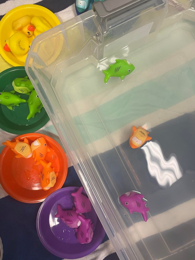 These warm summer days have us wanting to stay close to that air conditioner! One of my favorite things to do on a hot day is be next to some water, whether that is a pool, lake, or my dog’s pool that he doesn’t love to share. It keeps me cool! The same goes for your child, but sometimes just sitting in a pool isn’t their cup of tea. There are a variety of ways to spice up water play and facilitate language at the same time! Create a “Wash Station” for some of their toys that can get wet. (ex. Cars, trucks, babies, bath toys, animals, Little People, etc.) It may also be fun to let your child pick out some of their favorites. In addition, you’ll need water, bubbles (dish soap, shampoo, or bubble bath), towel, and a washcloth. If the sun is too much, these activities can be done in the bathtub, kitchen sink, or in a big plastic container.